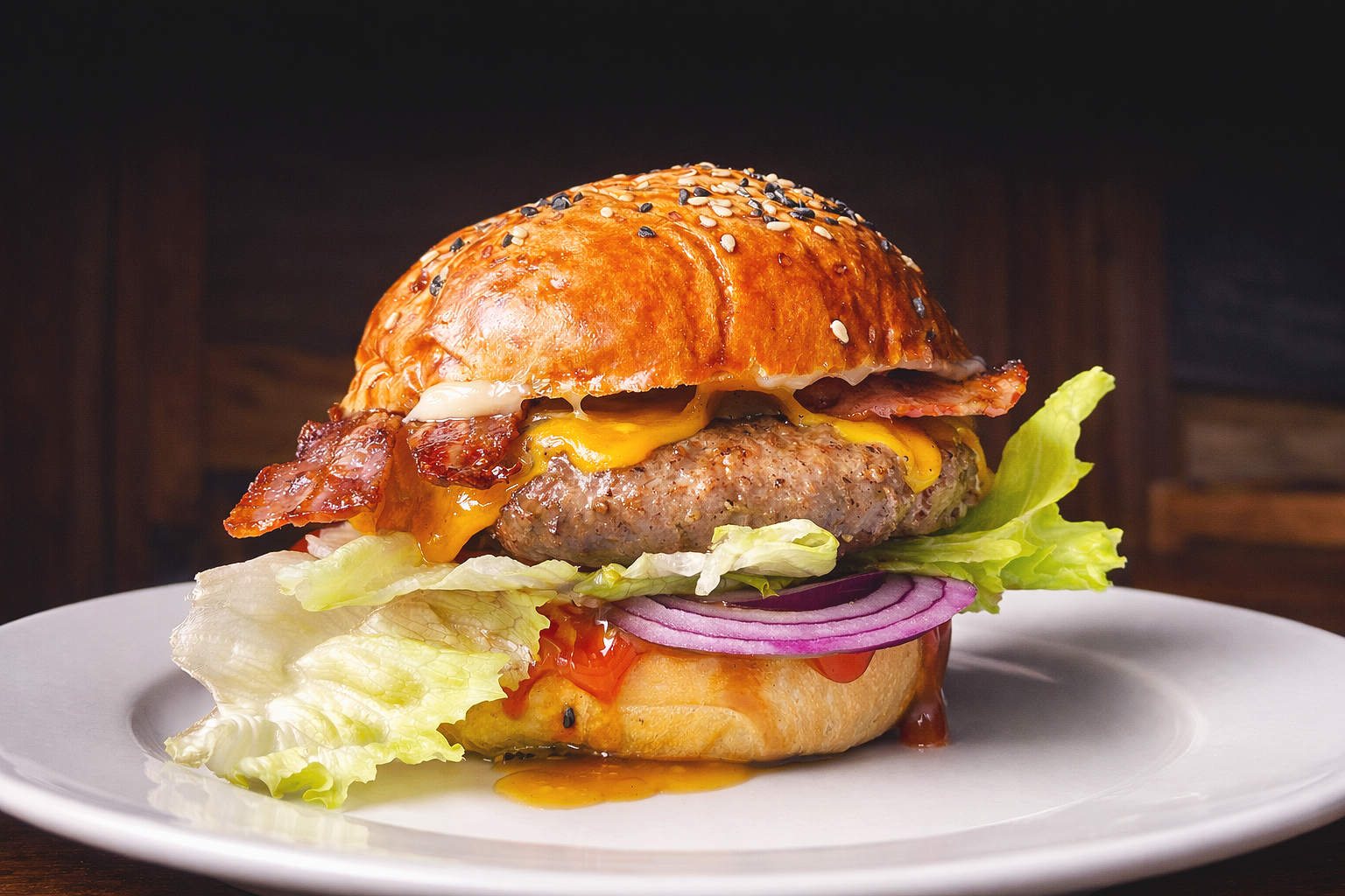 Hamburgerové bulky si pečeme sami a maso si sami meleme i mícháme do směsi, kterou jsme dlouhodobě ladili tak, aby byla šťavnatá, masitá a chuťově vyvážená. Nepoužíváme hotové polotovary ani průmyslové směsi.