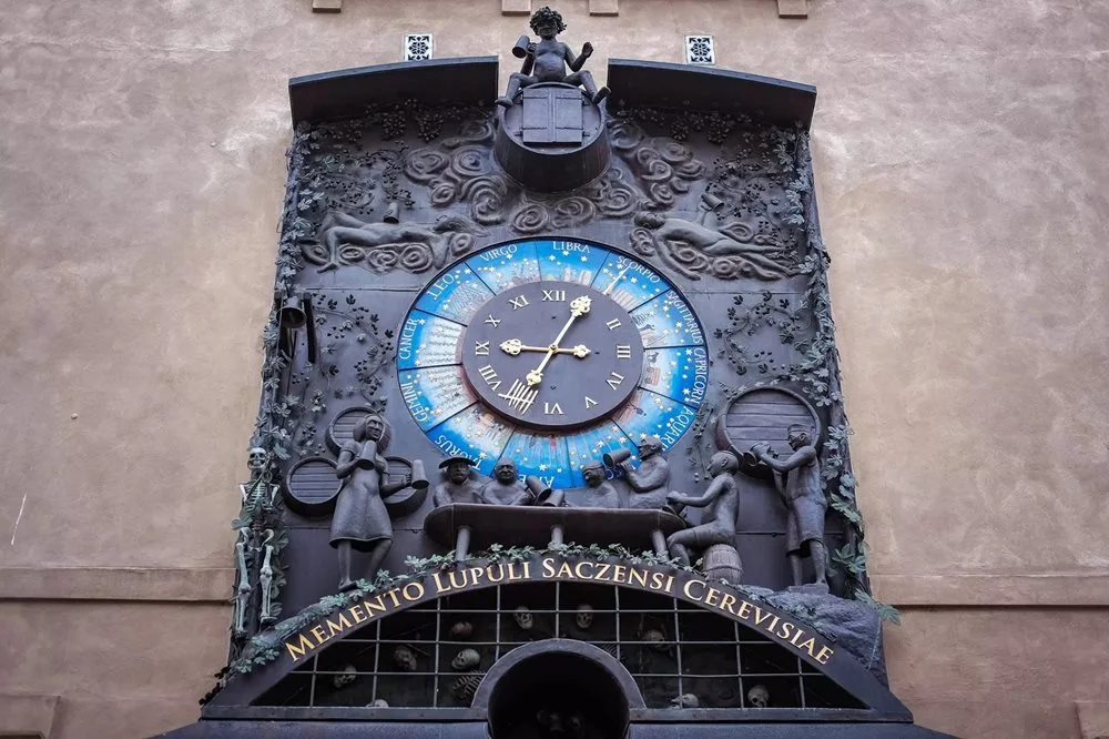 Plně funkční Chmelový orloj ukazuje čas, astrologické údaje, znamení zvěrokruhu a práce na chmelu v jednotlivých měsících. Každou celou hodinu se spustí odbíjení společně s pohybem objektů portálu a melodickým doprovodem a nachází se v těsné blízkosti restaurace El Toro.